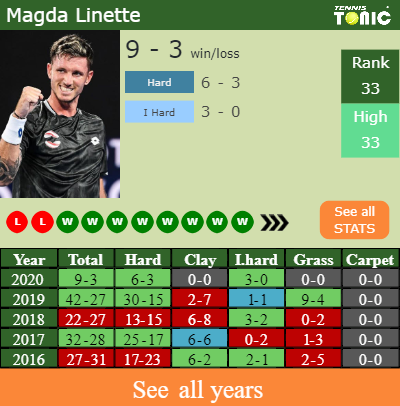 In terms of her career, Magda has an overall 171-162 record. She has positive 116-101 record on hard.