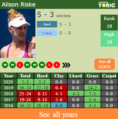 Riske has a 5-3 win-loss record in 2020, 5-3 on hard (See FULL STATS).