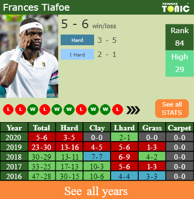 Tiafoe has a 5-6 win-loss record in 2020, 3-5 on hard (See FULL STATS).