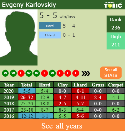 Karlovskiy has a 5-5 win-loss record in 2020, 0-1 on indoor hard courts (See FULL STATS).
