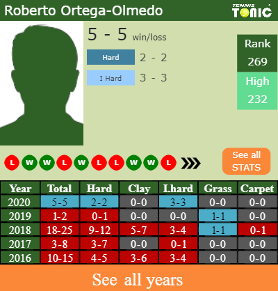 Ortega-Olmedo has a 5-5 win-loss record in 2020, 3-3 on indoor hard courts (See FULL STATS).