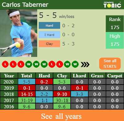 Carlos has a 5-5 win-loss record in 2020, 5-3 on clay (See FULL STATS).