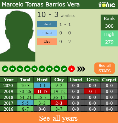 In terms of his career, Tomas Barrios Vera has an overall 112-66 record. He has positive 77-40 record on clay.