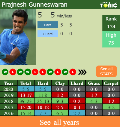 Prajnesh has a 5-5 win-loss record in 2020, 5-5 on hard (See FULL STATS).