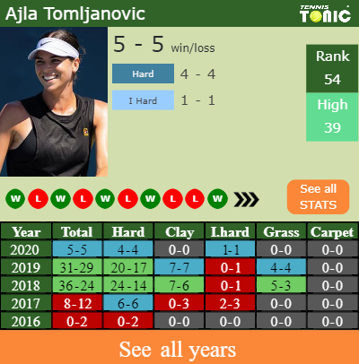Tomljanovic has a winning win-loss record in the last 10 years having won 54% of her matches (592-506). 4-4 on hard in 2020. Talking about her performance on the same surface of this competition, Tomljanovic has a 149-148 win-loss record in the last 10 years on hard.