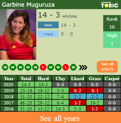 Muguruza has a solid win-loss record in the last 10 years having won 66% of her matches (1037-535). 14-3 on hard in 2020. Talking about her performance on the same surface of this competition, Muguruza has a 276-154 win-loss record in the last 10 years on hard.