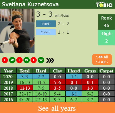 Kuznetsova has a solid record in the last 10 years having won 61% of her matches (657-416). 2-2 on hard in 2020. Talking about her performance on the same surface of this competition, Kuznetsova has a 243-152 win-loss record in the last 10 years on hard.