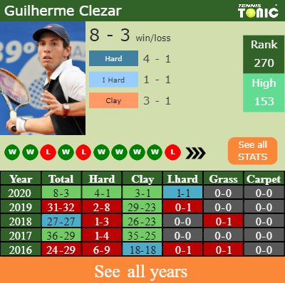 Guilherme has a 8-3 win-loss record in 2020, 1-1 on indoor hard courts (See FULL STATS).
