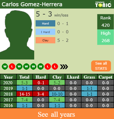 Gomez-Herrera has a 5-3 win-loss record in 2020, 0-0 on indoor hard courts (See FULL STATS).