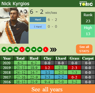 Nick has a 6-2 win-loss record in 2020, 6-2 on hard (See FULL STATS).