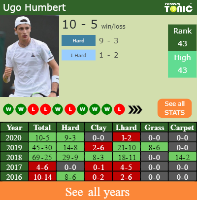 Ugo has a 10-5 win-loss record in 2020, 9-3 on hard (See FULL STATS).