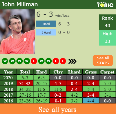 John has a 6-3 win-loss record in 2020, 6-3 on hard (See FULL STATS).