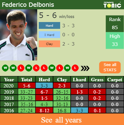 Delbonis has a 5-6 win-loss record in 2020, 2-3 on clay (See FULL STATS).