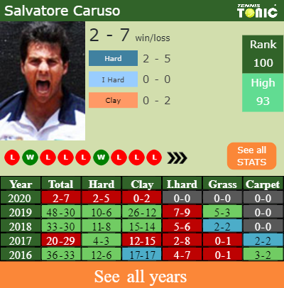 Caruso has a 2-7 win-loss record in 2020, 0-2 on clay (See FULL STATS).