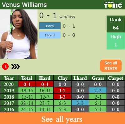 Venus has a 0-1 win-loss record in 2020, 0-1 on hard (See FULL STATS).