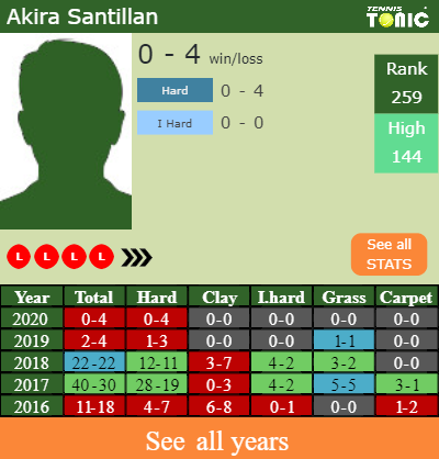 Santillan has a 0-4 win-loss record in 2020, 0-0 on indoor hard courts (See FULL STATS).