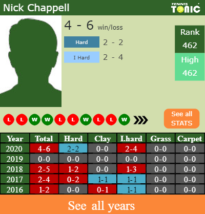 Chappell has a negative win-loss record in the last 8 years having won 36% of his matches (48-84). 2-4 on indoor hard courts in 2020. Regarding his performance on the same surface of this event, Chappell has a 11-21 win-loss record in the last 8 years on indoor hard courts.