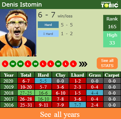 Istomin has a 6-7 win-loss record in 2020, 1-2 on indoor hard courts (See FULL STATS).