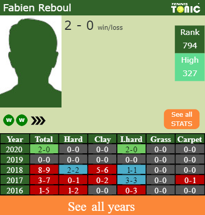 Reboul has a solid record in the last 5 years having won 61% of his matches (19-12). 2-0 on indoor hard courts in 2020. Regarding his performance on the same surface of this tournament, Reboul has a 14-21 win-loss record in the last 5 years on indoor hard courts.