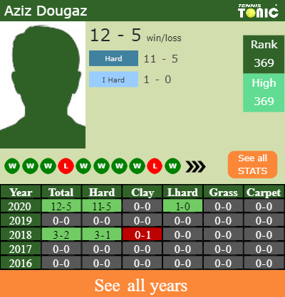 Dougaz has a fantastic record in the last 5 years having won 100% of his matches (5-0). 1-0 on indoor hard courts in 2020. In connection with his performance on the same surface of this tournament, Dougaz has a 15-7 record in the last 5 years on indoor hard courts.
