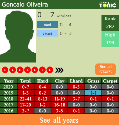 Oliveira has a 0-7 win-loss record in 2020, 0-3 on indoor hard courts (See FULL STATS).
