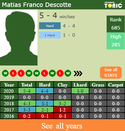Franco Descotte has a fantastic win-loss record in the last 7 years having won 100% of his matches (7-0). 1-0 on indoor hard courts in 2020. Talking about his performance on the same surface of this competition, Franco Descotte has a 16-15 record in the last 7 years on indoor hard courts.