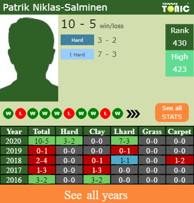 Niklas-Salminen has a solid record in the last 7 years having won 63% of his matches (64-38). 7-3 on indoor hard courts in 2020. Talking about his performance on the same surface of this competition, Niklas-Salminen has a 23-21 record in the last 7 years on indoor hard courts.