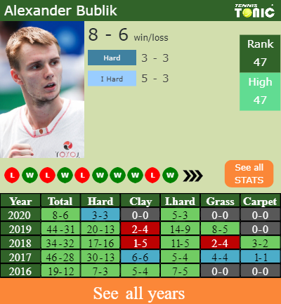 Bublik has a 8-6 win-loss record in 2020, 3-3 on hard (See FULL STATS).