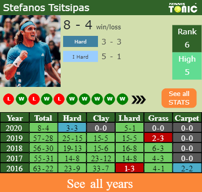 Stefanos has a 8-4 win-loss record in 2020, 3-3 on hard (See FULL STATS).
