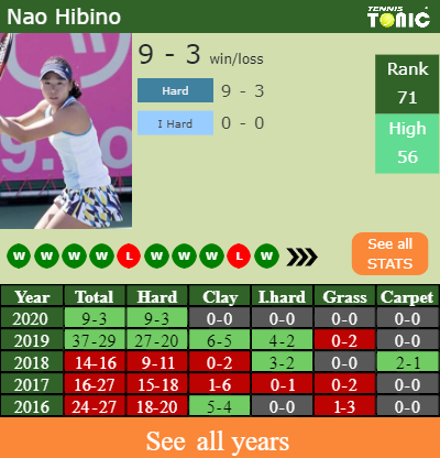 Hibino has a positive record in the last 10 years having won 54% of her matches (692-596). 9-3 on hard in 2020. In connection with her performance on the same surface of this event, Hibino has a 120-119 record in the last 10 years on hard.