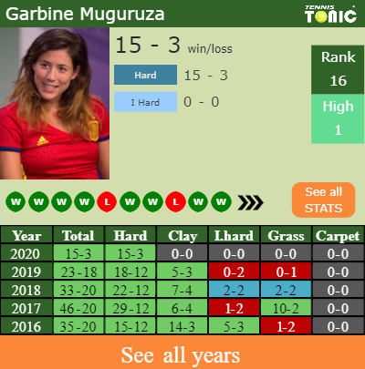 Muguruza has a solid record in the last 10 years having won 66% of her matches (1047-535). 15-3 on hard in 2020. Regarding her performance on the same surface of this competition, Muguruza has a 277-154 record in the last 10 years on hard.