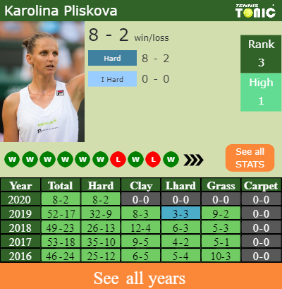The Czech has a 8-2 win-loss record in 2020, 8-2 on hard (See FULL STATS).