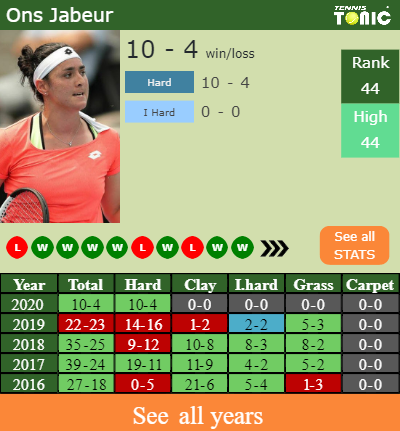 The Tunisian has a 10-4 win-loss record in 2020, 10-4 on hard (See FULL STATS).