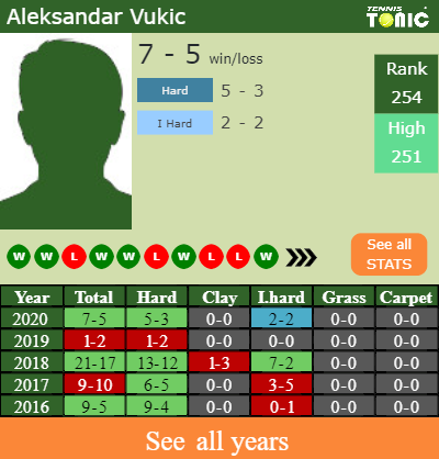 Vukic has a winning record in the last 6 years having won 56% of his matches (63-50). 2-2 on indoor hard courts in 2020. In connection with his performance on the same surface of this competition, Vukic has a 49-41 record in the last 6 years on indoor hard courts.
