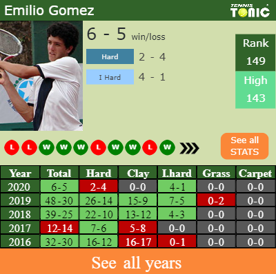 Gomez has a solid win-loss record in the last 10 years having won 61% of his matches (135-85). 4-1 on indoor hard courts in 2020. Regarding his performance on the same surface of this tournament, Gomez has a 186-154 win-loss record in the last 10 years on indoor hard courts.