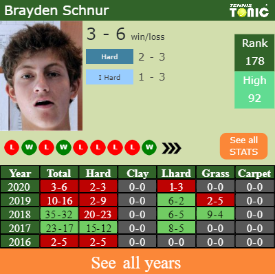 Schnur has a weak win-loss record in the last 8 years having won 44% of his matches (148-114). 1-3 on indoor hard courts in 2020. Talking about his performance on the same surface of this tournament, Schnur has a 81-89 win-loss record in the last 8 years on indoor hard courts.