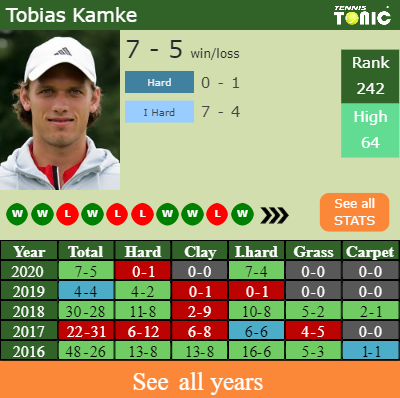 Kamke has a winning record in the last 10 years having won 59% of his matches (428-301). 7-4 on indoor hard courts in 2020. In connection with his performance on the same surface of this competition, Kamke has a 264-248 win-loss record in the last 10 years on indoor hard courts.