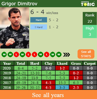 Dimitrov has a solid win-loss record in the last 10 years having won 62% of his matches (805-484). 5-2 on hard in 2020. Regarding his performance on the same surface of this competition, Dimitrov has a 329-205 record in the last 10 years on hard.