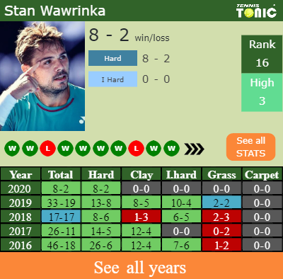 Wawrinka has a 8-2 win-loss record in 2020, 8-2 on hard (See FULL STATS).
