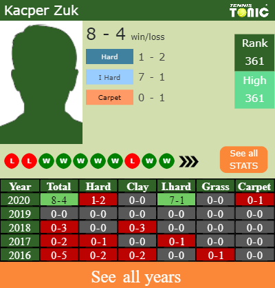 Zuk has a fantastic record in the last 5 years having won 83% of his matches (35-7). 7-1 on indoor hard courts in 2020. Regarding his performance on the same surface of this tournament, Zuk has a 8-14 win-loss record in the last 5 years on indoor hard courts.