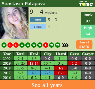 Potapova has a weak win-loss record in the last 6 years having won 42% of her matches (142-104). 5-3 on hard in 2020. In connection with her performance on the same surface of this tournament, Potapova has a 74-44 record in the last 6 years on hard.