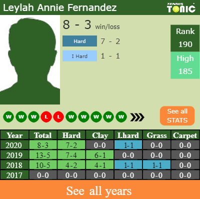 The Canadian has a 8-3 win-loss record in 2020, 7-2 on hard (See FULL STATS).