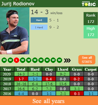 Rodionov has a losing record in the last 5 years having won 25% of his matches (86-29). 9-2 on indoor hard courts in 2020. In connection with his performance on the same surface of this tournament, Rodionov has a 71-36 win-loss record in the last 5 years on indoor hard courts.