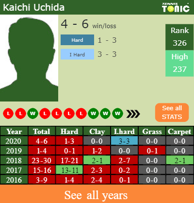 Uchida has a negative record in the last 10 years having won 30% of his matches (46-106). 3-3 on indoor hard courts in 2020. Regarding his performance on the same surface of this competition, Uchida has a 74-88 record in the last 10 years on indoor hard courts.