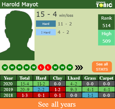 Mayot has a fantastic win-loss record in the last 3 years having won 71% of his matches (30-12). 4-2 on indoor hard courts in 2020. In connection with his performance on the same surface of this tournament, Mayot has a 36-16 win-loss record in the last 3 years on indoor hard courts.