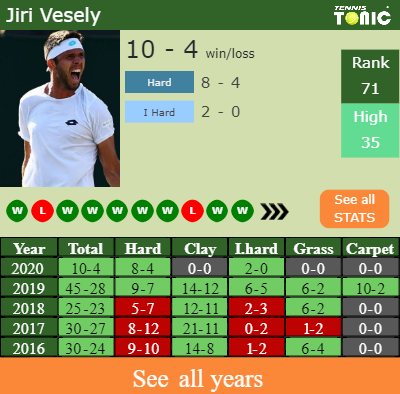 Vesely has won exactly 50% of his matches (157-154) in the last 10 years. 2-0 on indoor hard courts in 2020. Regarding his performance on the same surface of this competition, Vesely has a 259-185 record in the last 10 years on indoor hard courts.