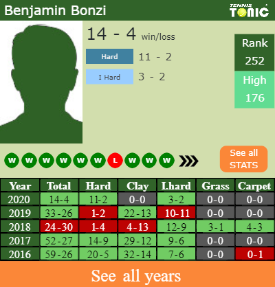 Bonzi has a unfavourable win-loss record in the last 5 years having won 46% of his matches (116-99). 3-2 on indoor hard courts in 2020. Regarding his performance on the same surface of this event, Bonzi has a 182-113 win-loss record in the last 5 years on indoor hard courts.