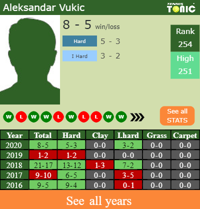 Vukic has a winning record in the last 6 years having won 58% of his matches (70-50). 3-2 on indoor hard courts in 2020. Talking about his performance on the same surface of this tournament, Vukic has a 50-41 win-loss record in the last 6 years on indoor hard courts.