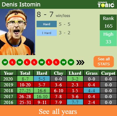 Istomin has a losing win-loss record in the last 10 years having won only 46% of his matches (212-253). 3-2 on indoor hard courts in 2020. . In connection with his performance on the same surface of this competition, Istomin has a 253-251 win-loss record in the last 10 years on indoor hard courts.