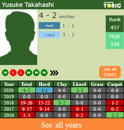 Takahashi has a winning win-loss record in the last 6 years having won 58% of his matches (18-13). 3-1 on indoor hard courts in 2020. Regarding his performance on the same surface of this competition, Takahashi has a 35-50 win-loss record in the last 6 years on indoor hard courts.